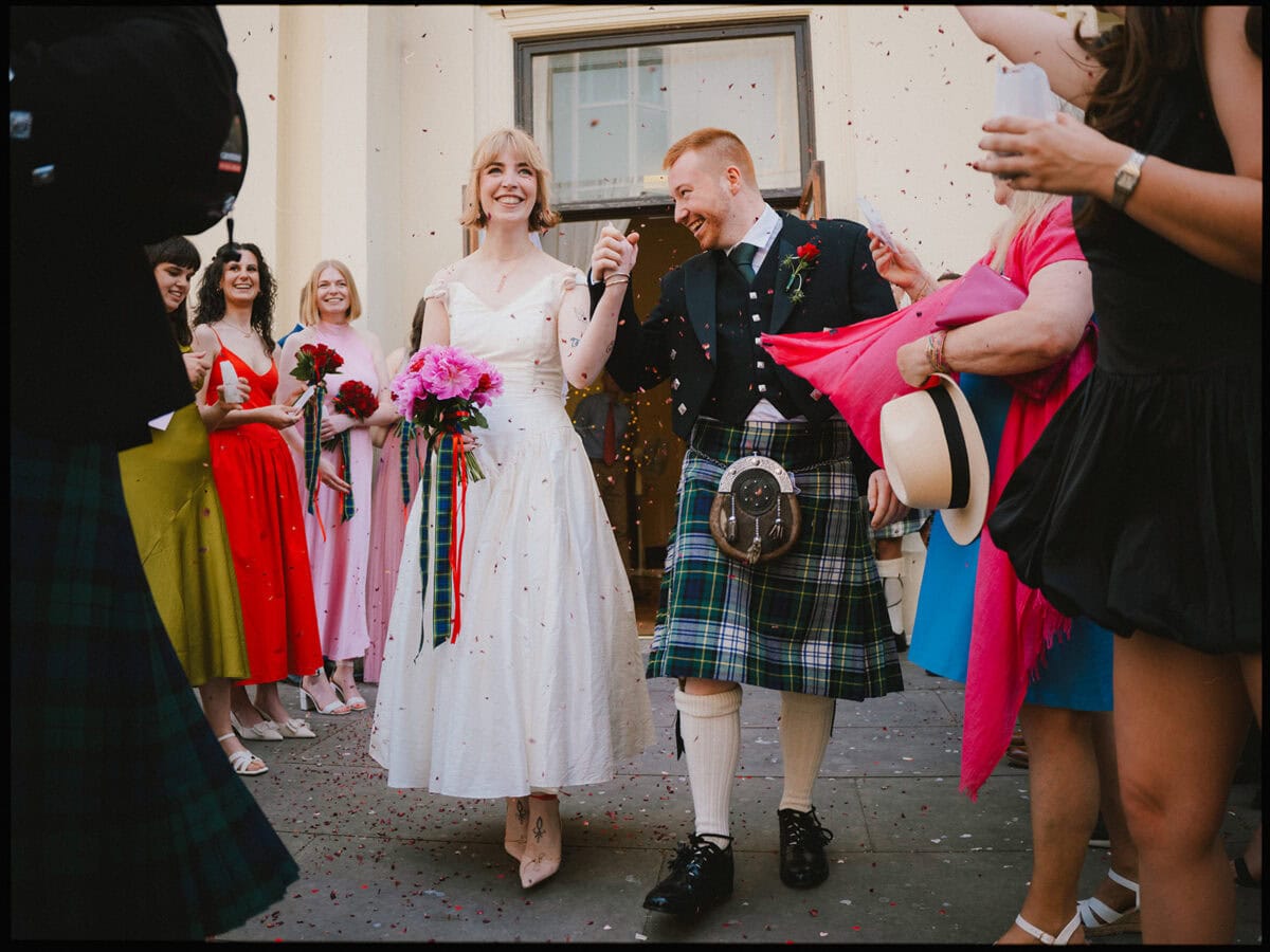 As they exited, the rest of the guests were waiting outside as bagpipes were playing, confetti flying, and champagne corks popping.