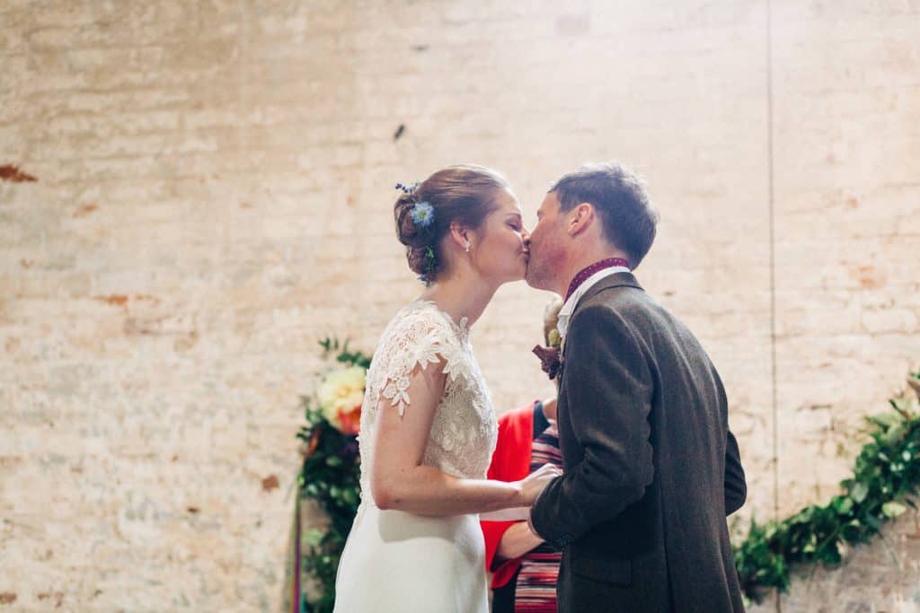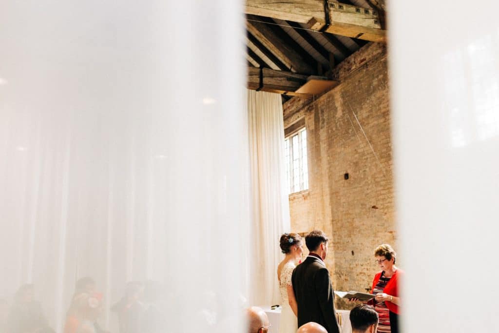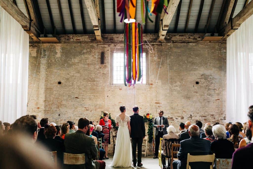 The Riding Stables at Calke Abbey is one of the most impressive wedding spaces I’ve photographed. It’s huge, rustic, and atmospheric — the kind of space that feels grand without being over-the-top. John & Francesca gathered all their friends and family here for the ceremony, with the vaulted ceilings and exposed brick creating the perfect backdrop for their vows.