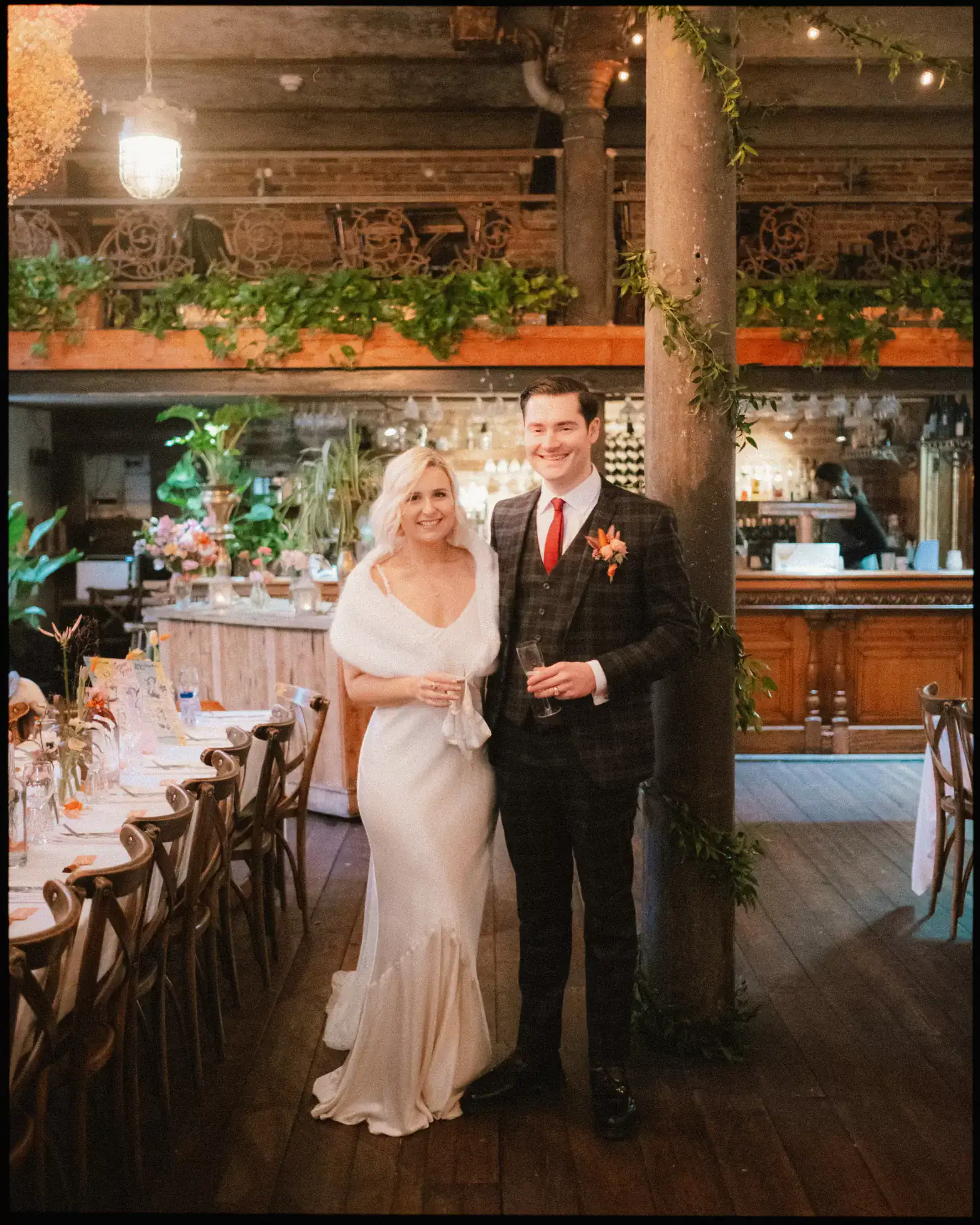 A converted warehouse in Clapton with exposed brick, industrial beams, warm festoon lighting, and a dancefloor that fills fast. It’s the kind of venue that doesn’t need much styling because the space already has more personality than most. Dolly and Sean knew that — and they brought their own anyway.
