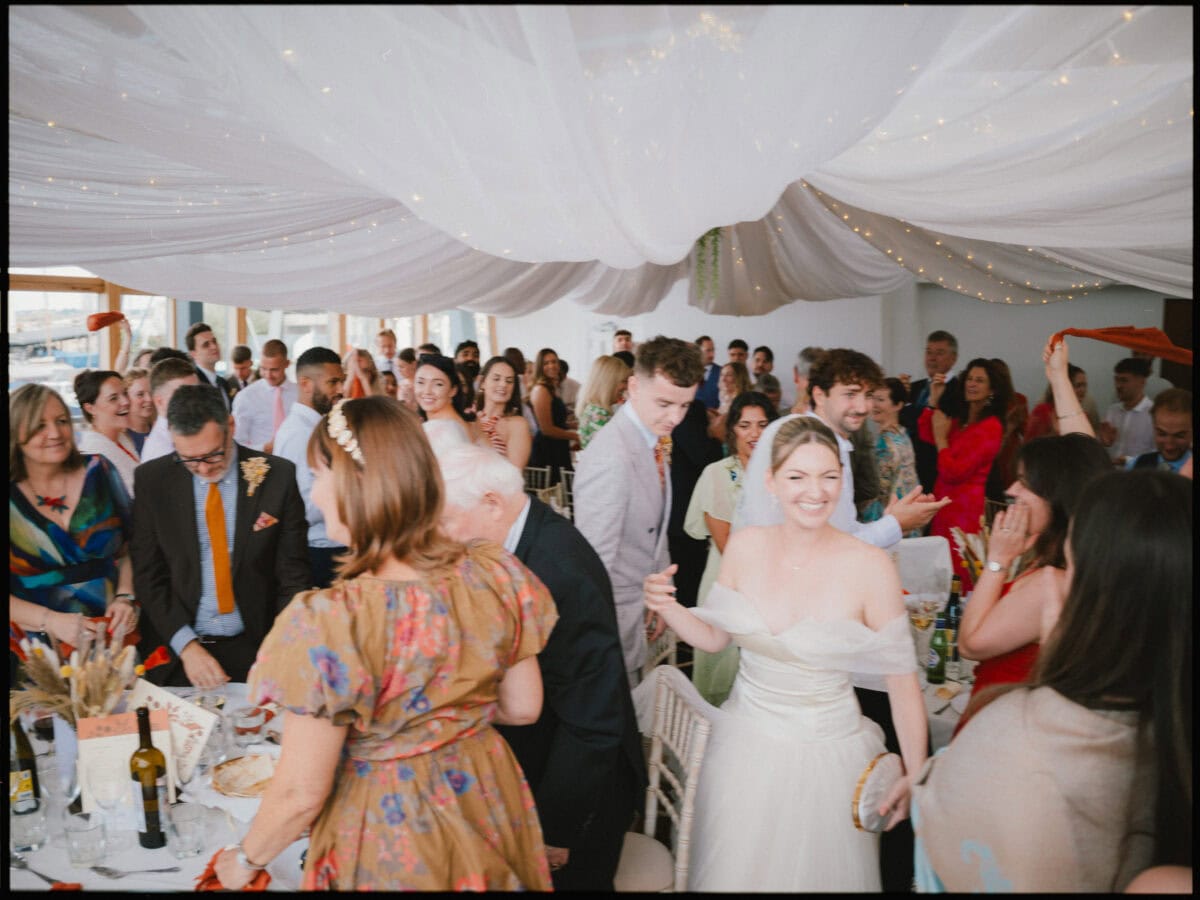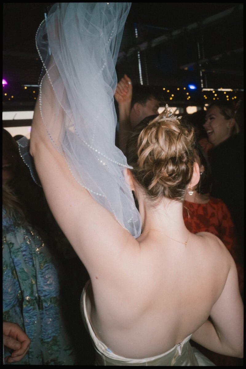 We slipped outside for portraits as the sun dropped — the Thames calm, the skyline catching the last of the light, London doing what London does at golden hour. Then back inside and the dancefloor filled immediately. Music, laughter, the room getting louder as the evening went on. Greenwich Yacht Club shifts completely after dark — from calm riverside reception to something considerably more energetic. Nathan and Jess’s crowd were ready for both.