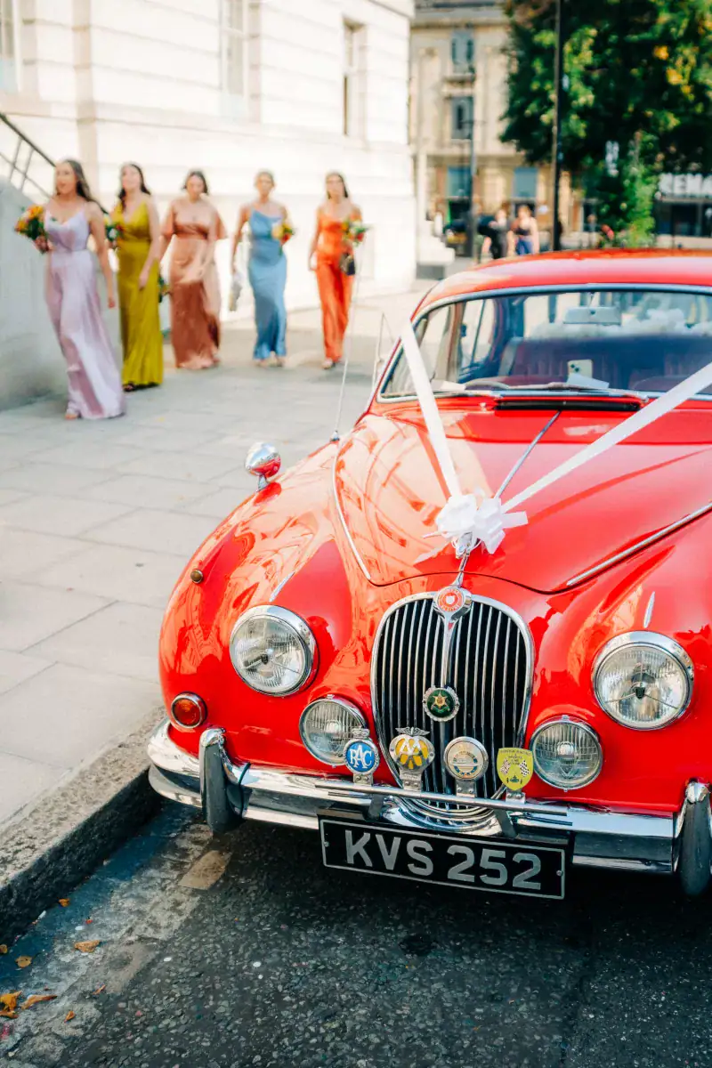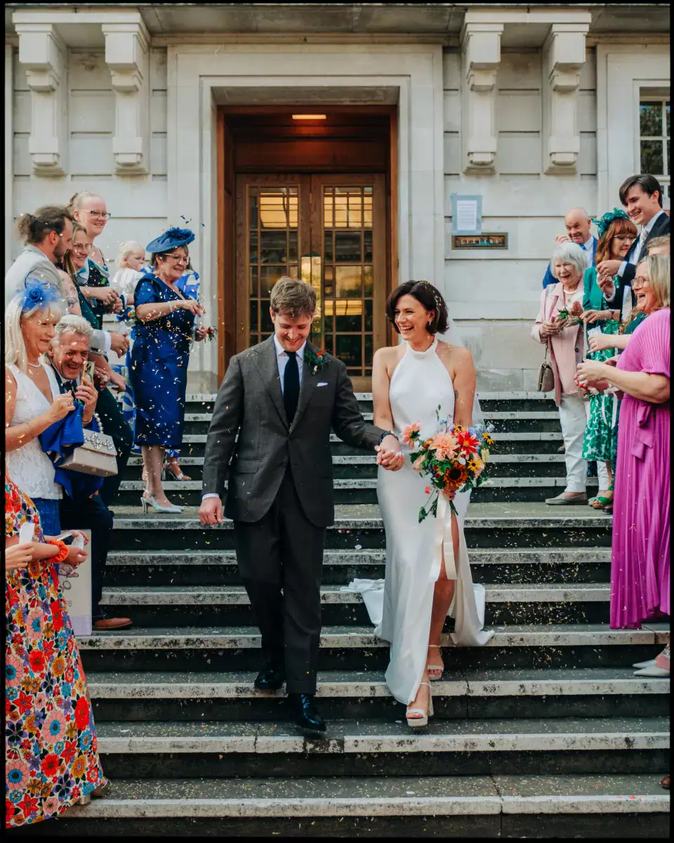 Hackney Town Hall is one of my favourite London ceremony spots. Not just for its art-deco architecture but for the atmosphere on those steps. Frances & Jack walked out into a shower of confetti with buses, cyclists, and Hackney life carrying on all around them. That mix of everyday London and big, joyful celebration is what makes this venue so special to photograph. Guests cheered, laughed, and hugged in the sunshine. The colour of the flowers and outfits made the photos feel full of energy and life.