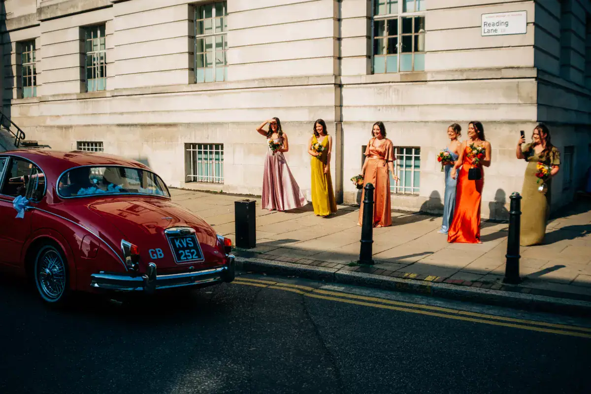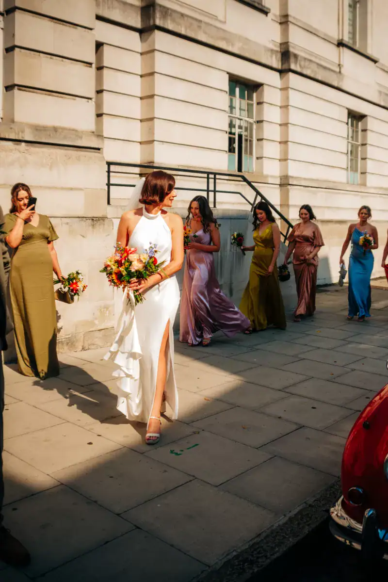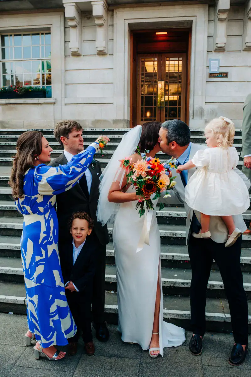 Hackney Town Hall is one of my favourite London ceremony spots. Not just for its art-deco architecture but for the atmosphere on those steps. Frances & Jack walked out into a shower of confetti with buses, cyclists, and Hackney life carrying on all around them. That mix of everyday London and big, joyful celebration is what makes this venue so special to photograph. Guests cheered, laughed, and hugged in the sunshine. The colour of the flowers and outfits made the photos feel full of energy and life.
