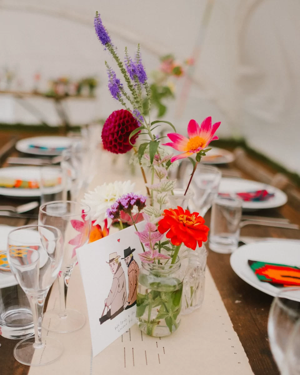 The reception marquee was full of colourful streamers — not subtle, not understated, completely committed to the party. Long tables, bright decorations, the kind of room that tells you exactly what kind of afternoon is coming.