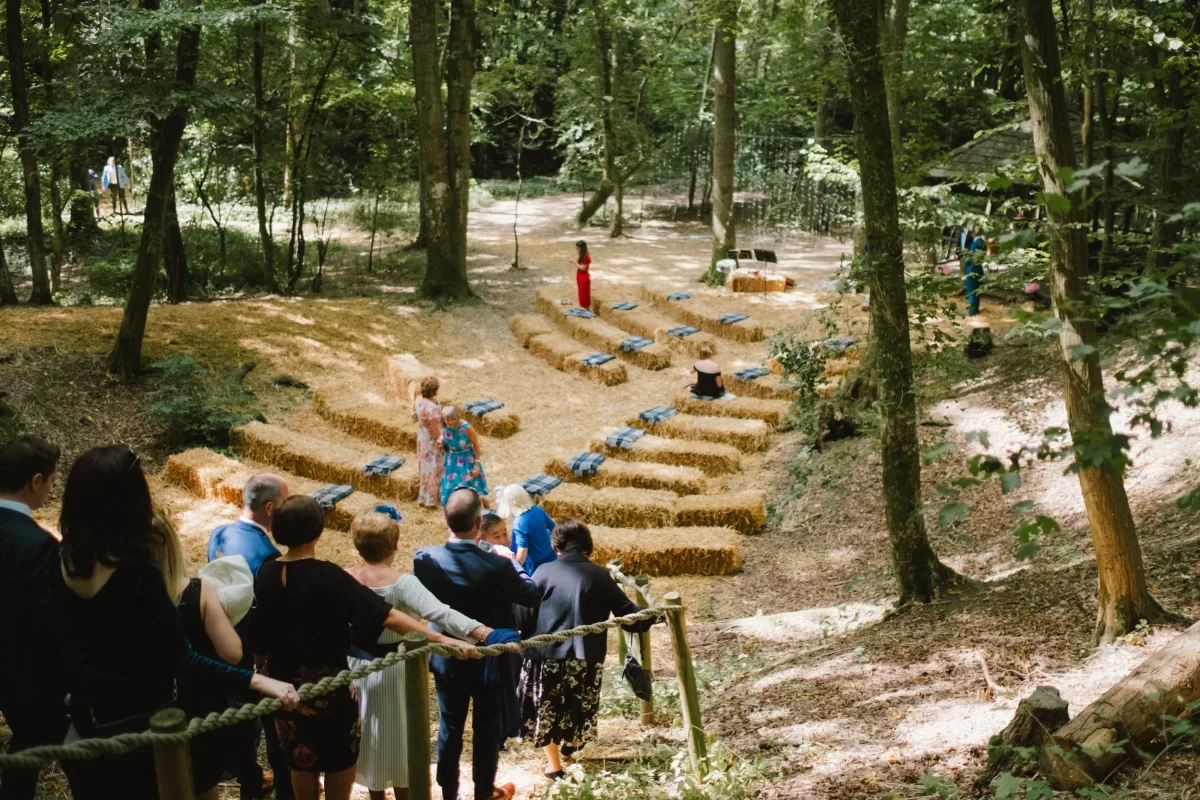 Jen and Luke’s wedding was a big one — a full field of people who were clearly there to have a good time. The ceremony was on hay bales in the woodland clearing, with singing that carried through the trees and set the tone for everything that followed.