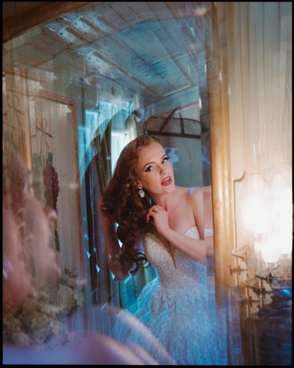 Alice got changed in a vintage railway carriage. No bridal suite or glam squad—just her, a mirror, some lipstick, and a kaleidoscope of late morning light. I leaned into the chaos and captured a dreamy portrait through a kaleidoscope filter. A small creative flex. It felt honest and surreal in the best way.