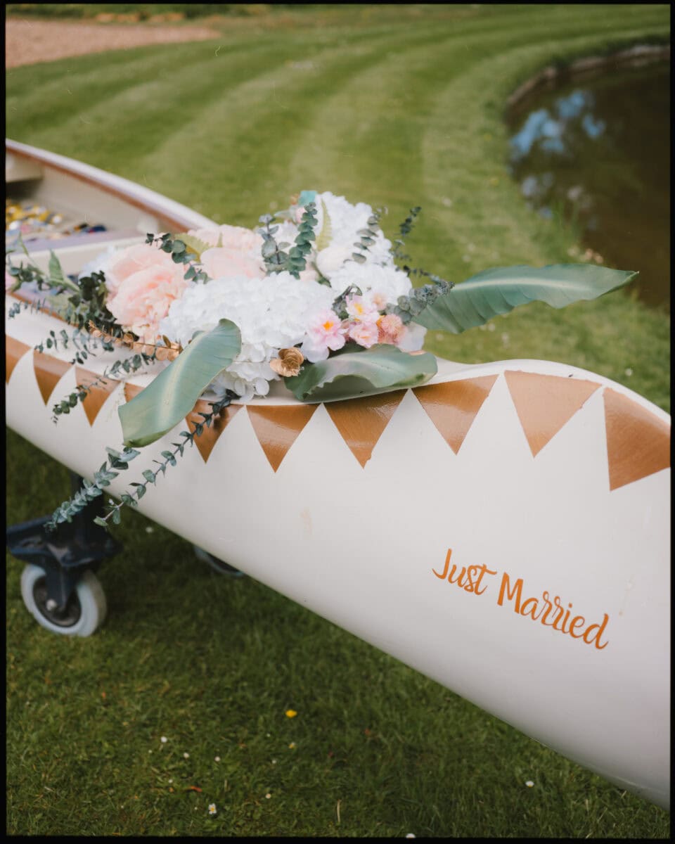 They crossed the bridge, jumped a broom, and were met with a flurry of bells and confetti from their guests. Drinks were served from a canoe with “Just Married” painted down the side. Cake was eaten before dinner. The vibe was more garden party than wedding production—and it was perfect.
