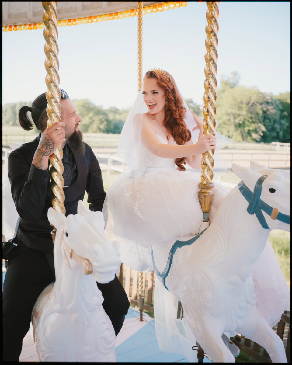 There was a carousel (technically a galloper), which they rode like kids at a fair. Later came toasts from horn mugs, organ music echoing through the barn, and golden hour quiet by the lake. They threw on matching jackets, sat on a bench together, and just… exhaled.
