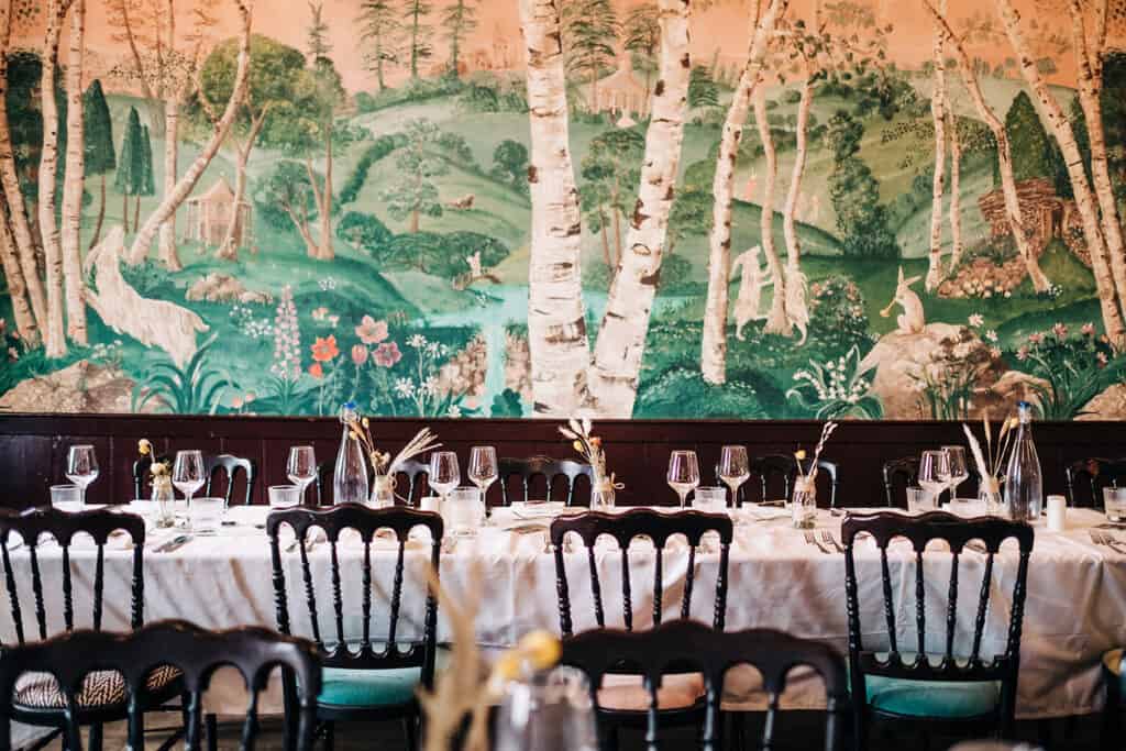 The Pub Spaces — banquet tables in the Stable, quirky décor, roaring fires.